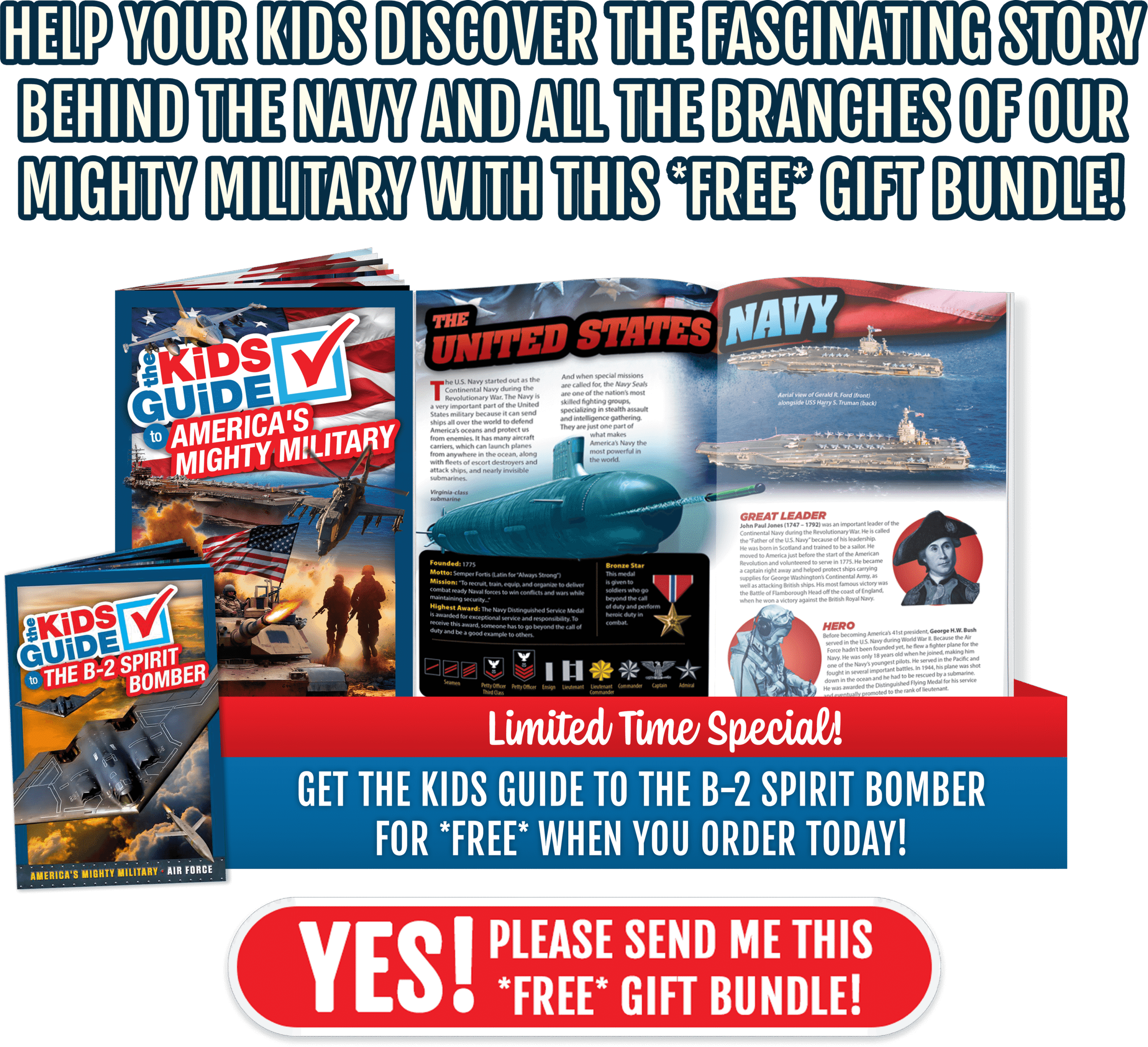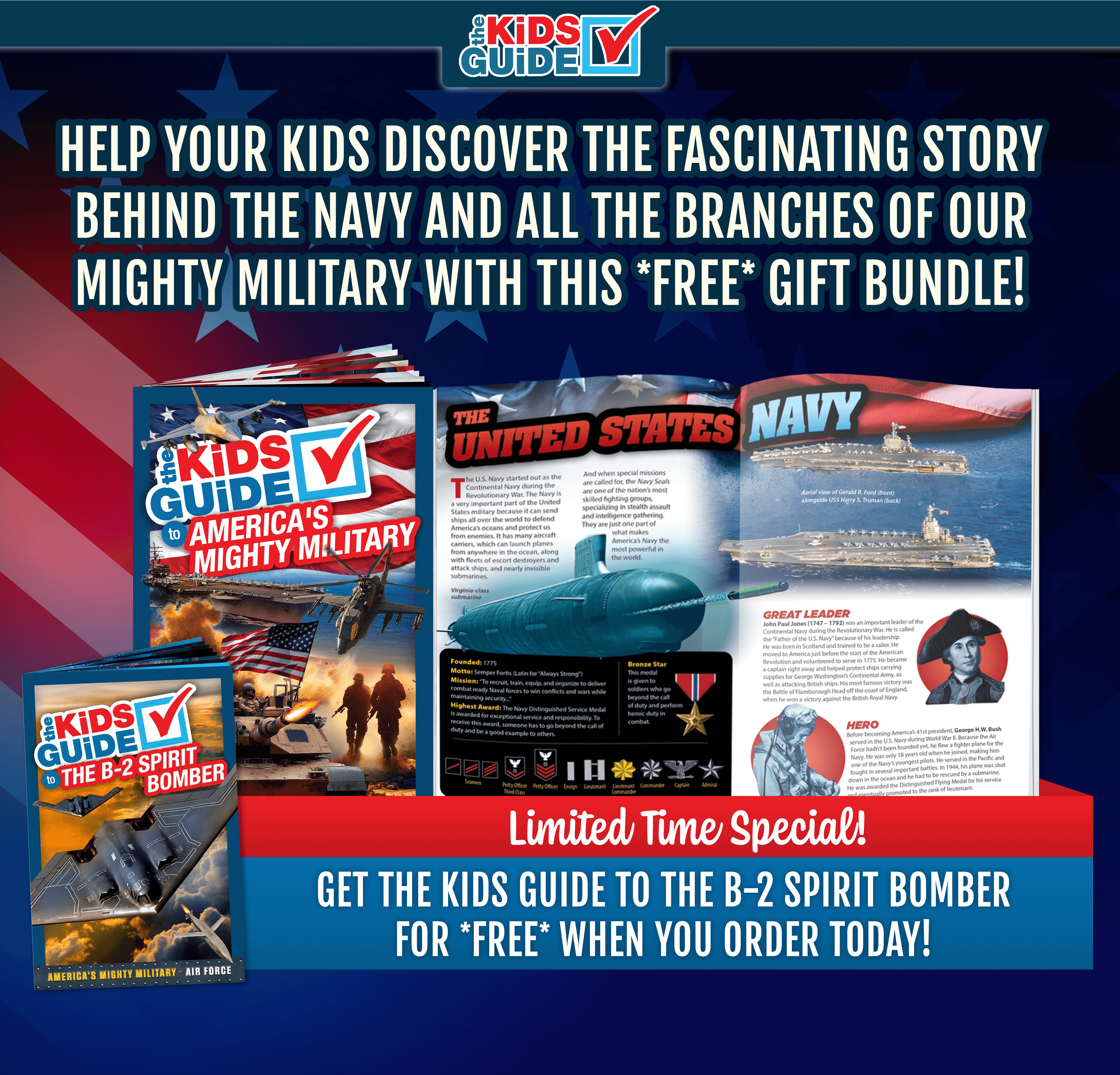 For a limited time, we’re giving away this patriotic gift bundle featuring The Kids Guide to America’s Mighty Military and The Kids Guide to The B-2 Spirit Bomber for *FREE*. Filled with real stories, gripping history, and exciting facts, these guides ignite a deep respect for our heroes and the impressive technology that keep us safe. You just need to pay $1 s&p each, which is a tiny price to shape the next generation’s pride!