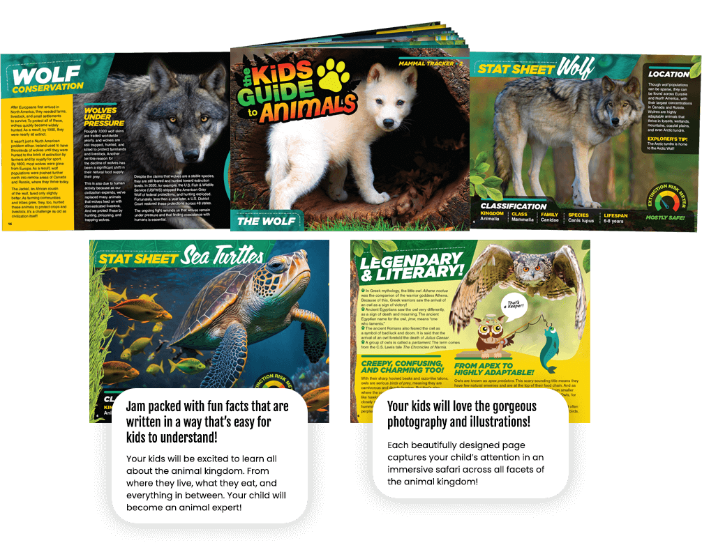 At The Kids Guide to Animals, we believe in the power of curiosity and the joy of discovery. Our mission is to provide high-quality, engaging educational materials that inspire children to explore and appreciate the natural world. Join us on this exciting journey and watch your child’s love for learning grow! *And, when you take advantage of this special offer, you’ll get a new title from The Kids Guide to Animals every three to four weeks. You just pay $29.96 once every 3 months.