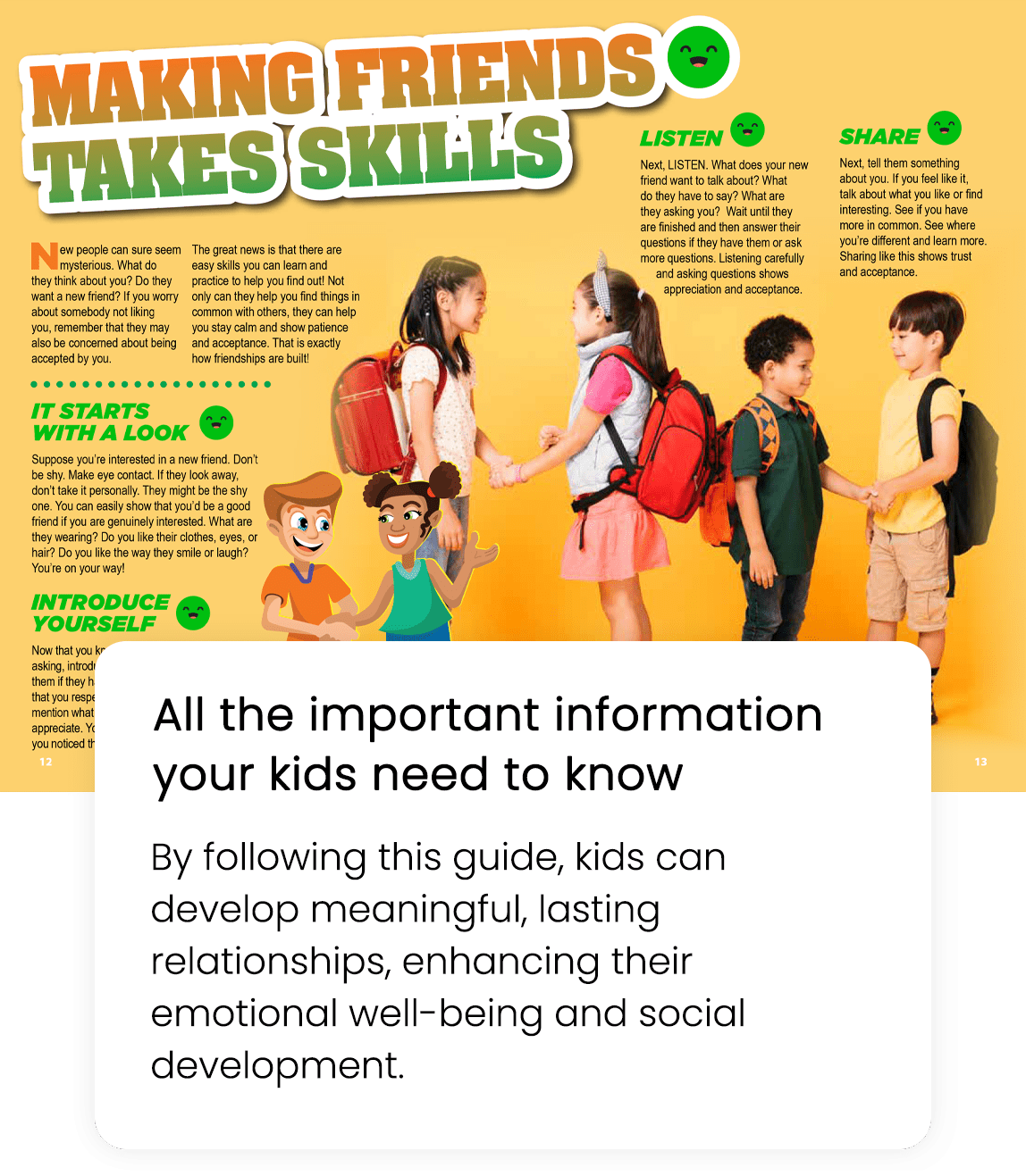 That’s why we created The Kids Guide to Making Friends and we’re giving it away for *FREE*. With this fun guide, your child will learn the essential skills for building strong, lasting friendships. From understanding the importance of empathy and kindness to mastering effective communication and conflict resolution, this guide is packed helpful tips and advice to develop great friendships that can last a lifetime.