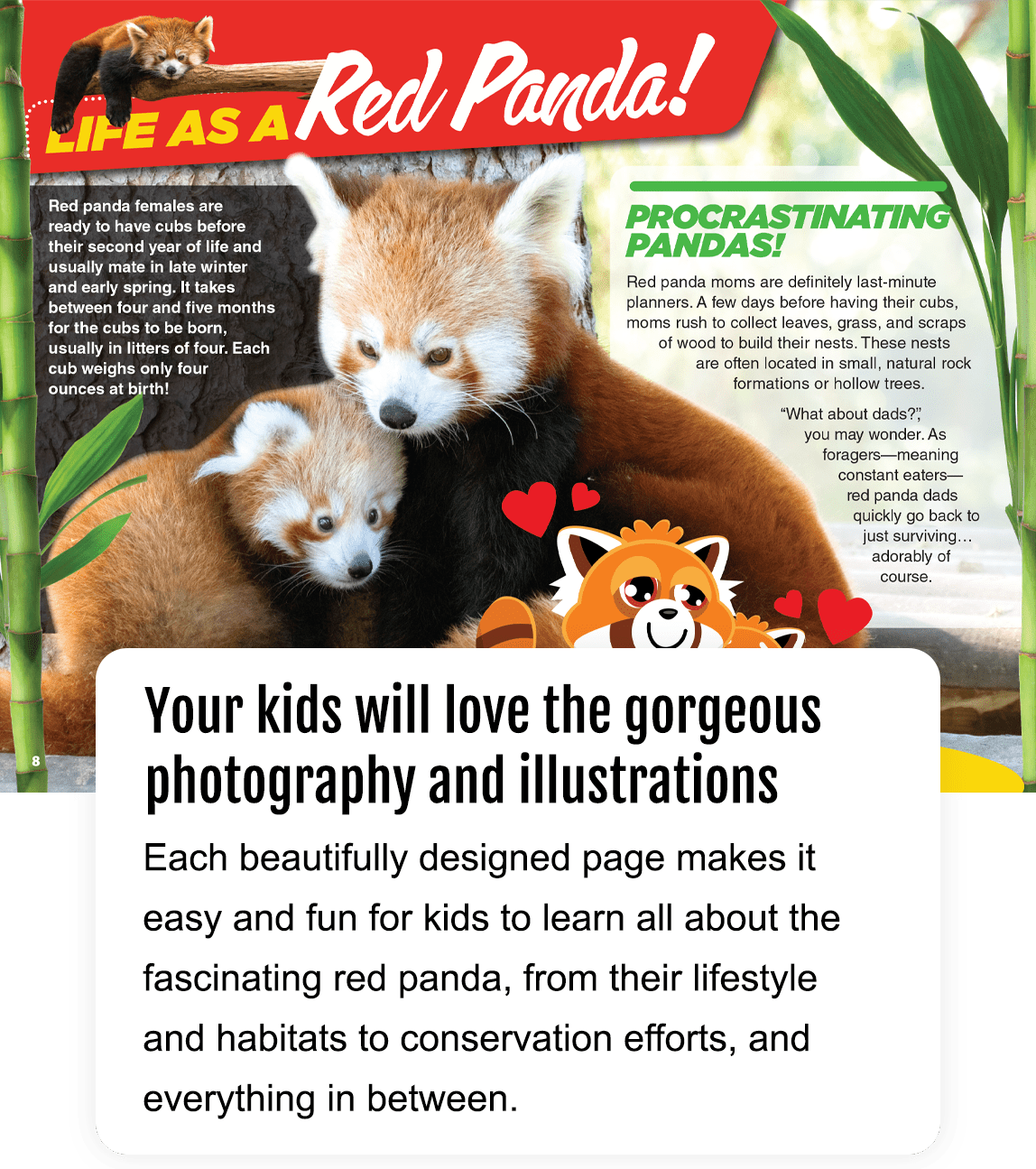 As your kids read, they’ll discover red panda’s ideal climate, what they eat, how they communicate, how they raise their cubs, and so much more. Plus they’ll learn important conservation steps they can take to help red pandas thrive for generations to come.